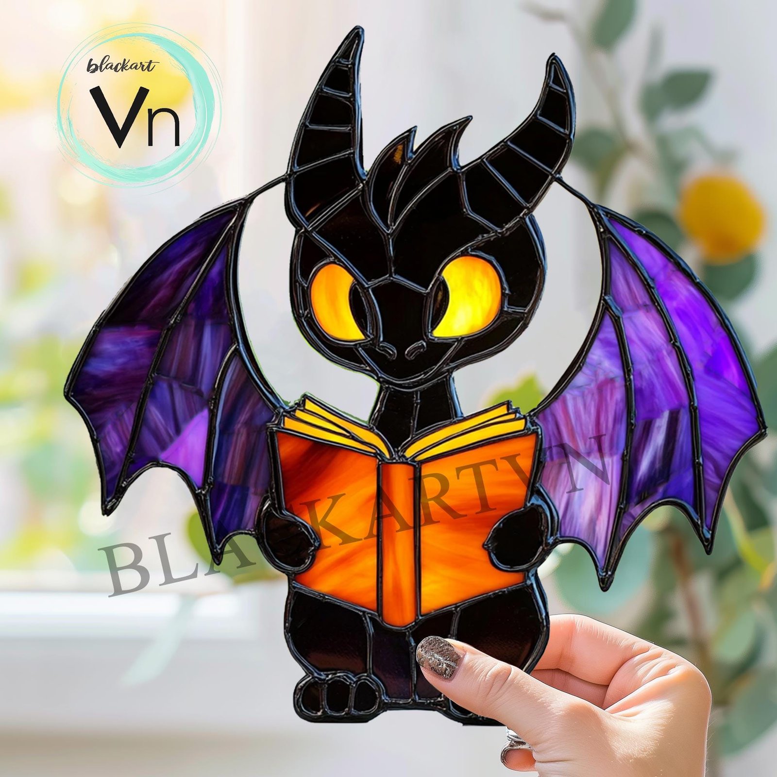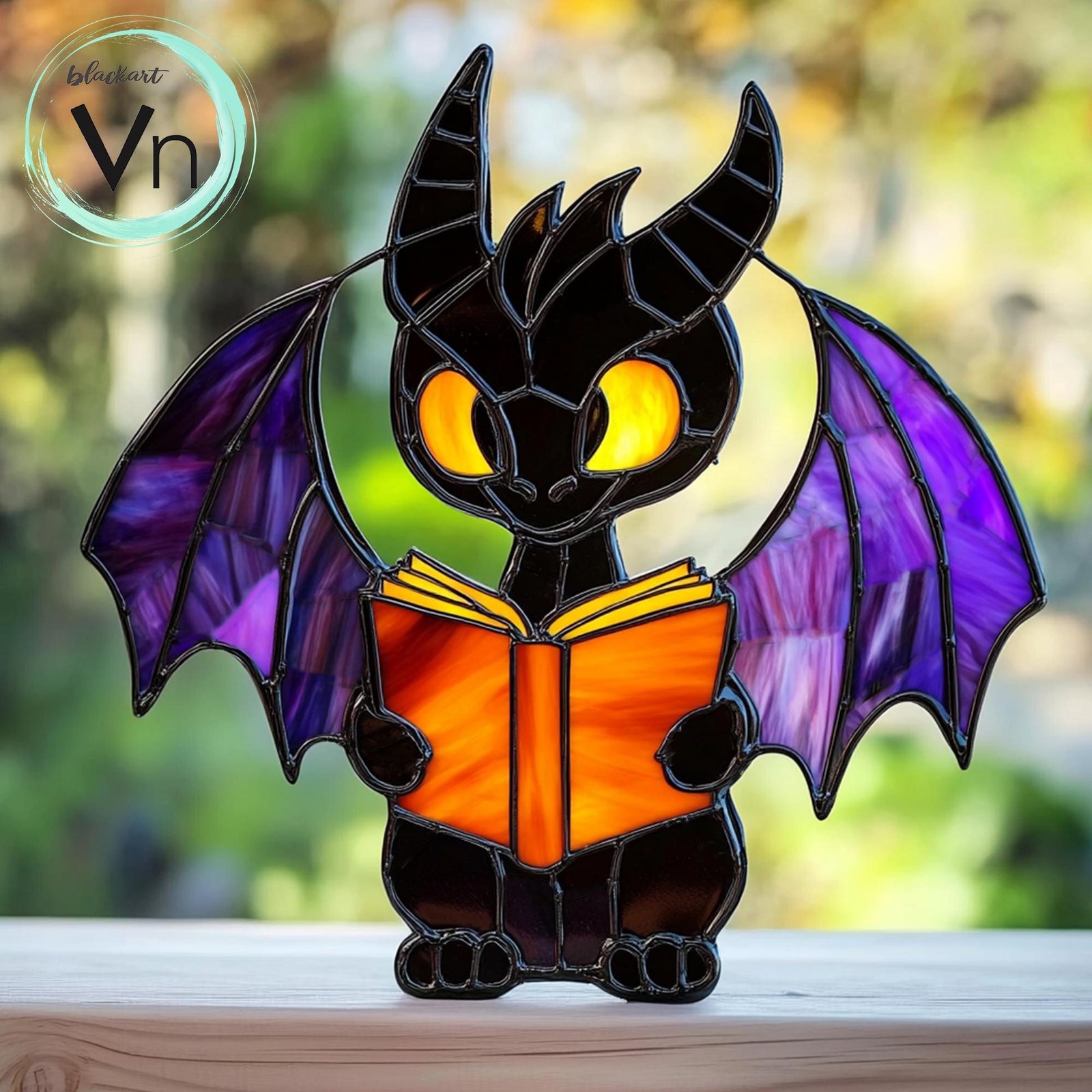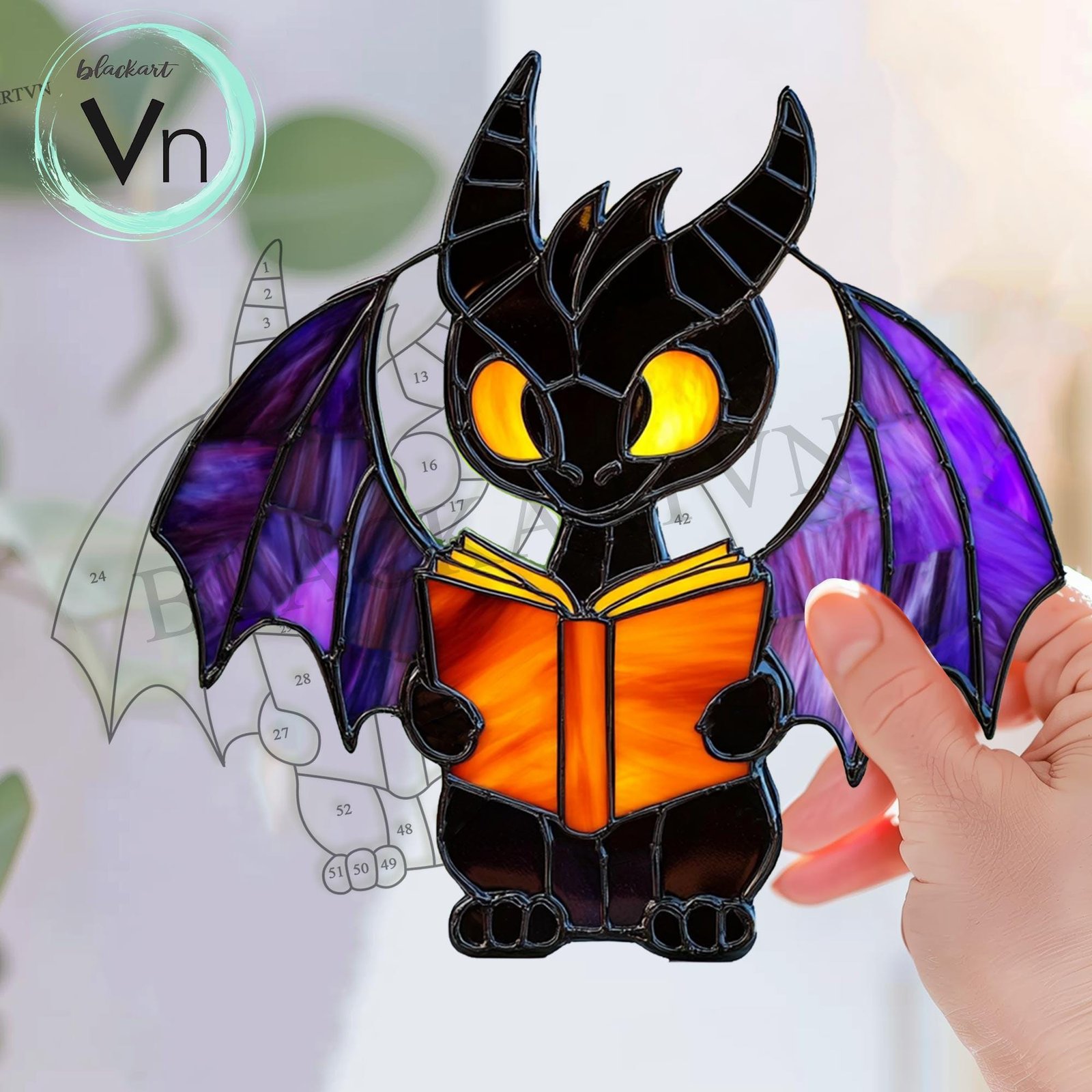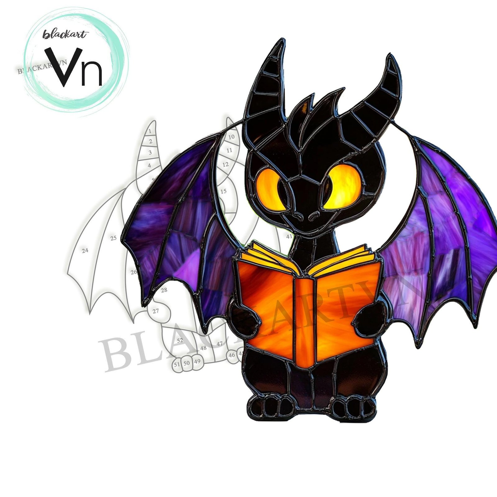 Digital Download Reading Book Dragon Glass Pattern, Stained glass model, magical dragon stained glass window hanging