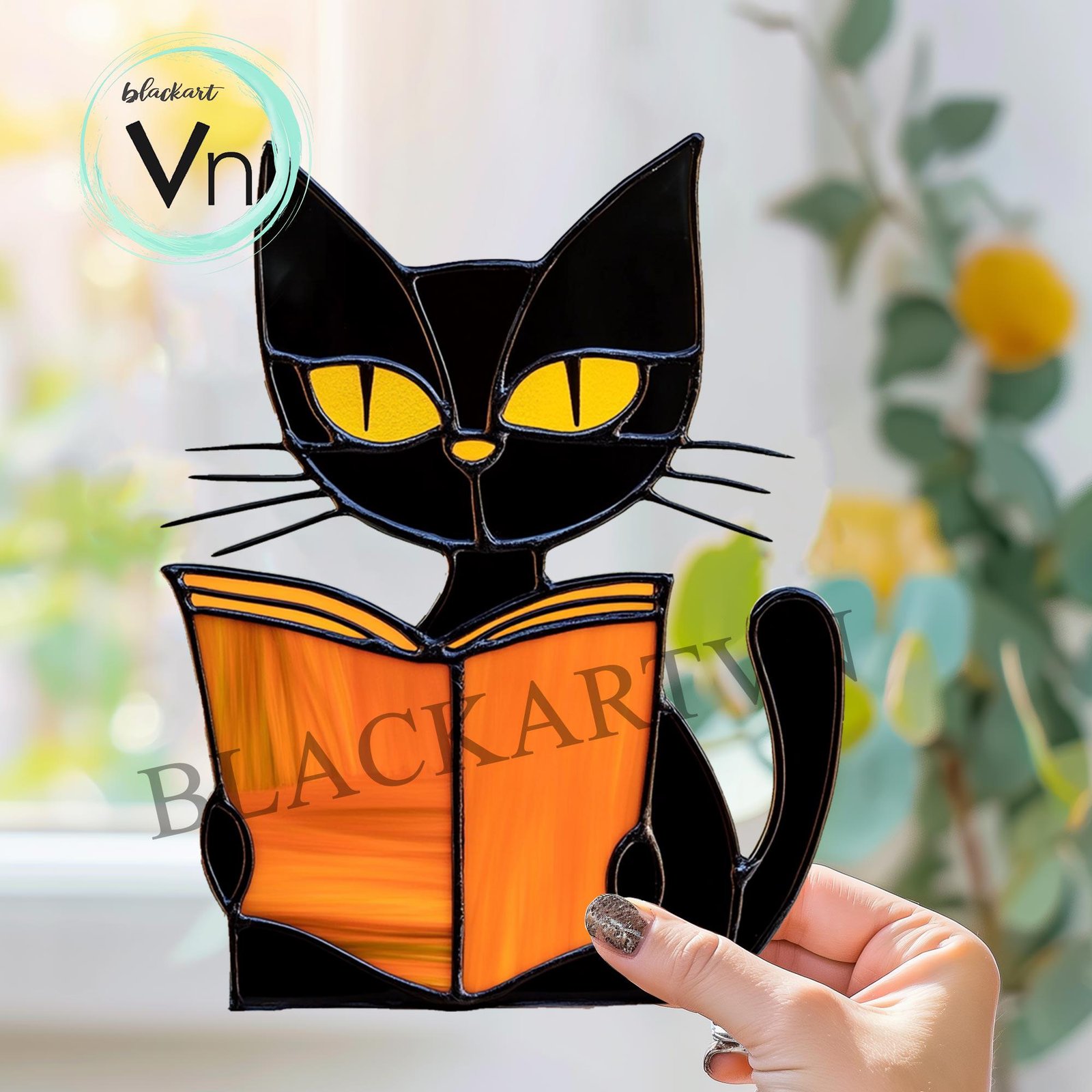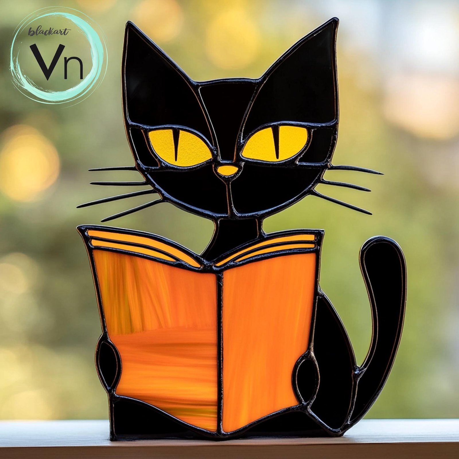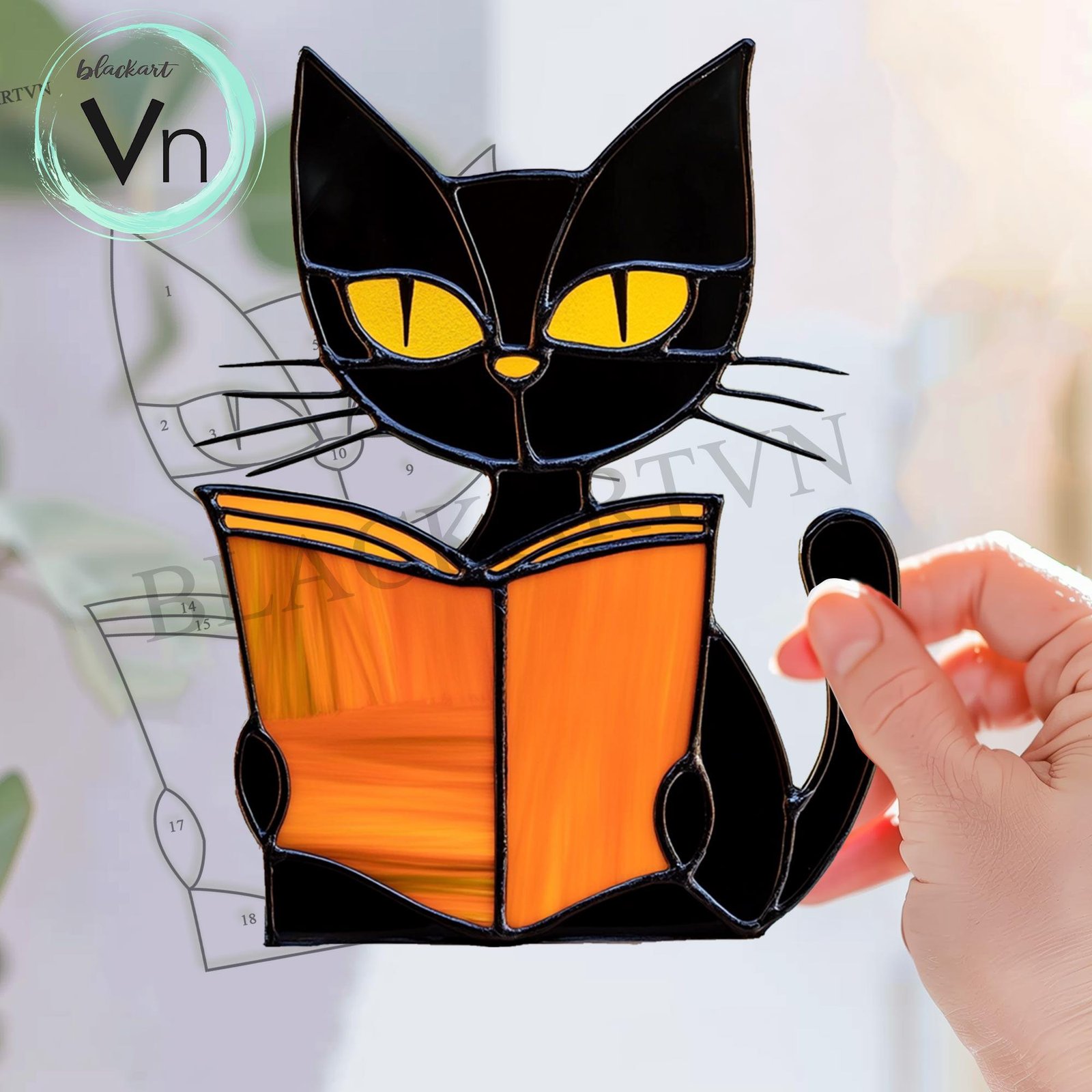 PATTERNS Cat Reading Book, Stained glass Hanging decor Art Gifts for book lovers Glass wall decor Gift idea for cat lover,Digital Download